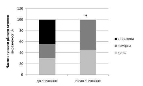 Після лікування у пацієнтів достовірно знижувався рівень тривожності з 23,35+7,36 до 16,9+7,16 (p=0,0027) (рис.2): за результатами дослідження за шкалою Гамільтона легка тривожність спостерігалася у 9 (45%), помірна у 11 (55%) (рис.4).