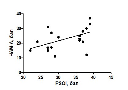 Проведено кореляційний аналіз між показниками тривоги та даними Піттсбурзького опитувальника, шкали МоСА, ШАС, MFIS. Виявлено достовірний прямий кореляційних зв'язок між: показниками шкали Гамільтона та даними Піттсбурзького опитувальника сну r=0,51 (p=0,02) (рис. 1), показниками шкали Гамільтона та балами ШАС r=0,83 (p<0,0001). Отже, чим більшим був рівень тривоги у пацієнтів з РС,тим більш вираженими у них були порушення сну та рівень астенії. В той же час, не виявлено достовірного зв’язку між показниками тривоги за шкалою Гамільтона та даними оцінки когнітивних функцій за шкалою МоСА (p>0,05), а також балами за шкалою МFIS.