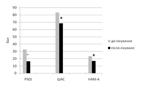 Порушення сну за тривожним типом було виявлено у всіх обстежених пацієнтів (100%). Відповідно до результатів Піттсбурзького опитувальника, виділяли легкі, помірні та тяжкі порушення сну. Легкі порушення виявлено до лікування у 2 (10%) пацієнтів, помірні - у 7 (35%), тяжкі -у 11 (55%) хворих. Згідно з даними шкали Гамільтона, легку тривожність спостерігали у 6(30%), помірну – у 5(25%), тяжку – у 9(45%) пацієнтів до лікування. Відповідно до показників шкали МоСА, у 5 (25%) пацієнтів не виявлено когнітивних порушень, помірні когнітивні порушення діагностовано у 12 обстежених (60%), виражені — у 3-х хворих (15%). За результатами MFIS, незначну втому виявлено у 2 (10%) пацієнтів, помірно виражену - у 7 (35%), виражену - у 9 (45%), значно виражену - у 2 (10%) хворих. Згідно з даними ШАС, астенії не виявлено у 1 пацієнта (5%), астенію слабкого ступеня діагностовано у 3 (15%), помірну — у 11 (55%), виражену — у 5 (25%).
